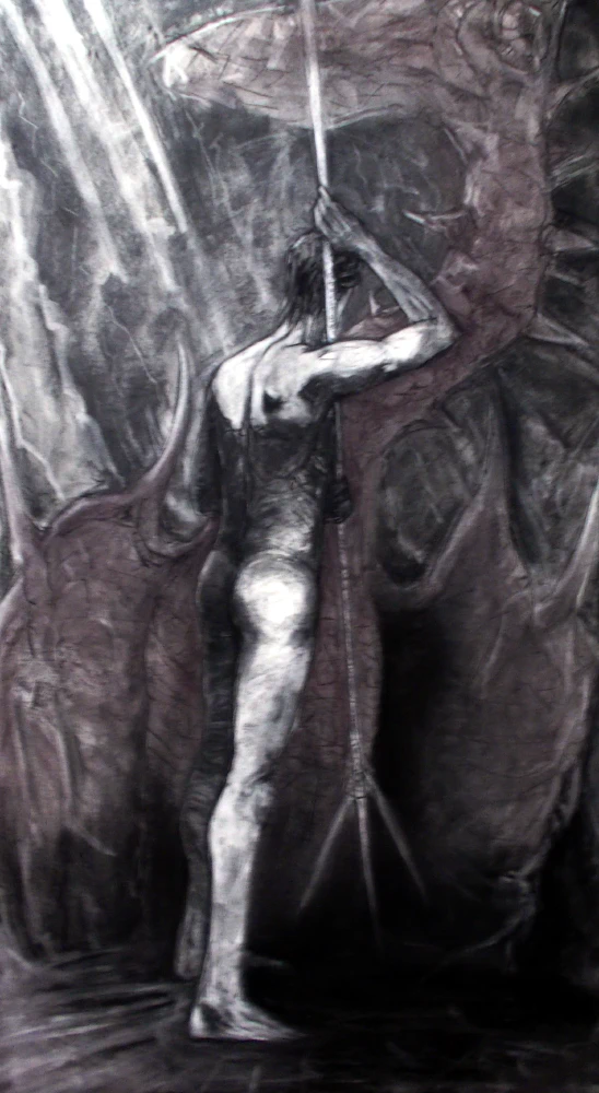 Mannelijk model 'Saint-Martin' staat klaar om de fictieve draak in zijn hoofd te overwinnen...